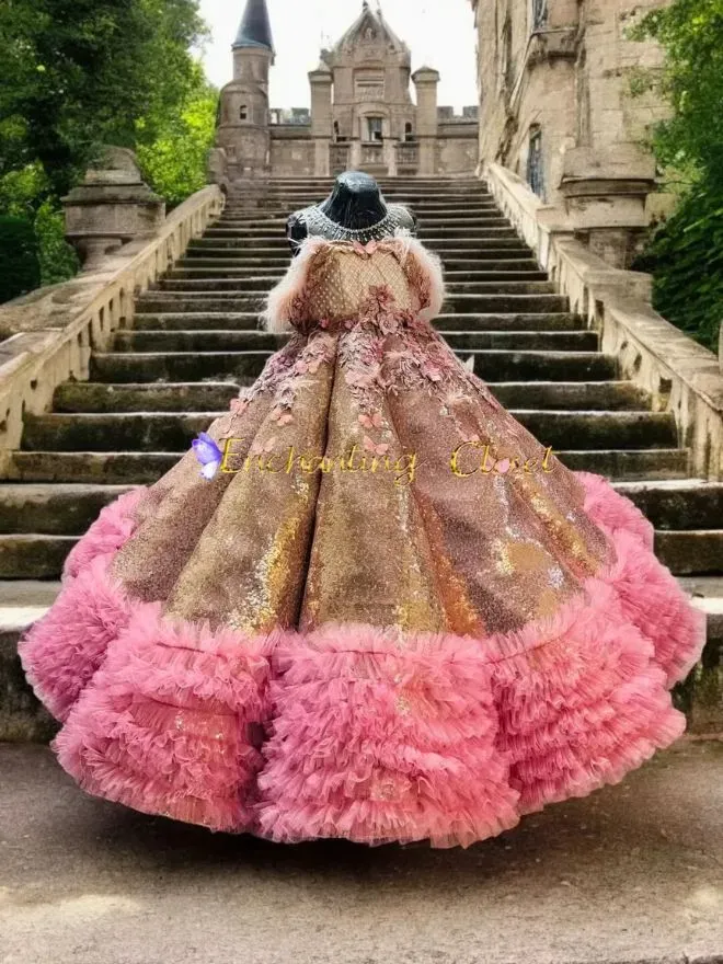 • Luxury metallic sequins umbrella pink gown with offshoulder ostrich feathers and beads on neck