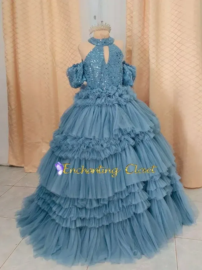 • Layered soft tulle dusty blue turtle neck cut gown