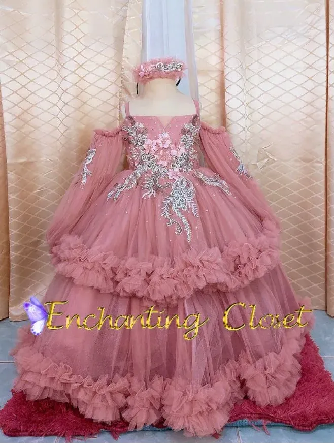 • Double layer pink soft tulle gown, with offshoulder bubble sleeves