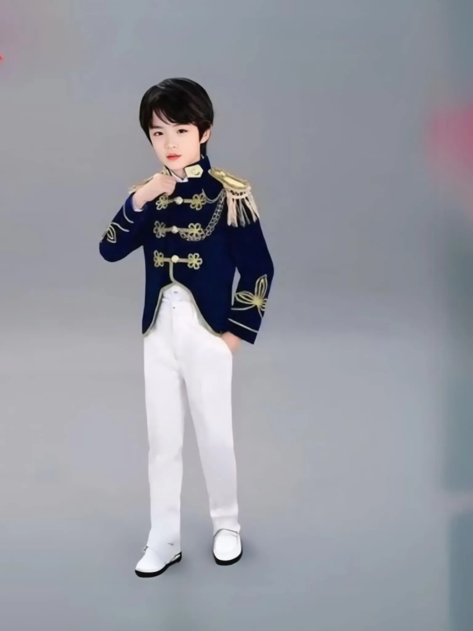 • Blue velvet prince outfit with gold shoulder board