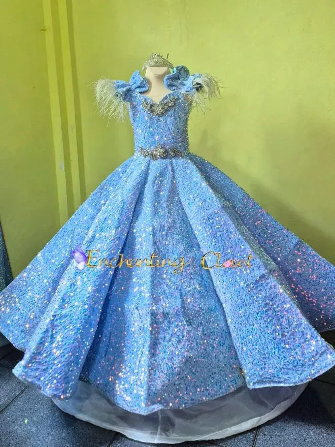 • Light Blue sequins with  ostrich feather offshoulder  sleeves