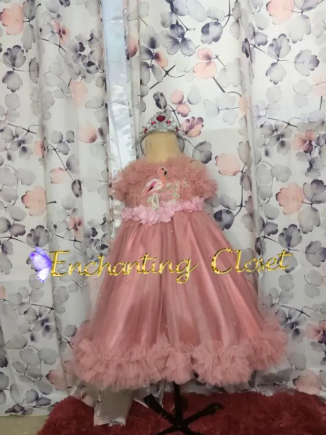 • Blush pink ruffled gown  attached with flamingo patch.