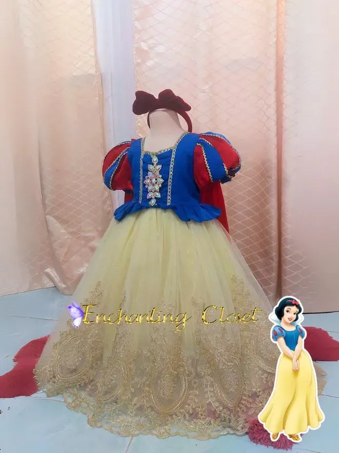 Blue and yellow puff dress with red cape